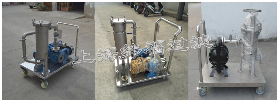 移動(dòng)過濾系統(tǒng)主要結(jié)構(gòu)組成:氣動(dòng)隔膜泵(可以根據(jù)客戶要求進(jìn)行選型配置)與過濾器采用快裝連接(接口有DN50,20 ),管道易拆卸易清洗,單袋式過濾器(流量大小可以根據(jù)工況進(jìn)行選型),過濾元件(過濾袋、燒結(jié)網(wǎng),濾芯,微孔濾芯型根據(jù)客戶要求的選配),壓差報(bào)警器(選配),壓力表(選配),排氣閥(選配)??蛻衄F(xiàn)場(chǎng)只需將管道與泵的連接,過濾器的出口與灌裝連接,即可使用。推車設(shè)計(jì),移動(dòng)靈活,隨移隨用,可操作性強(qiáng),可在多個(gè)工位使用。